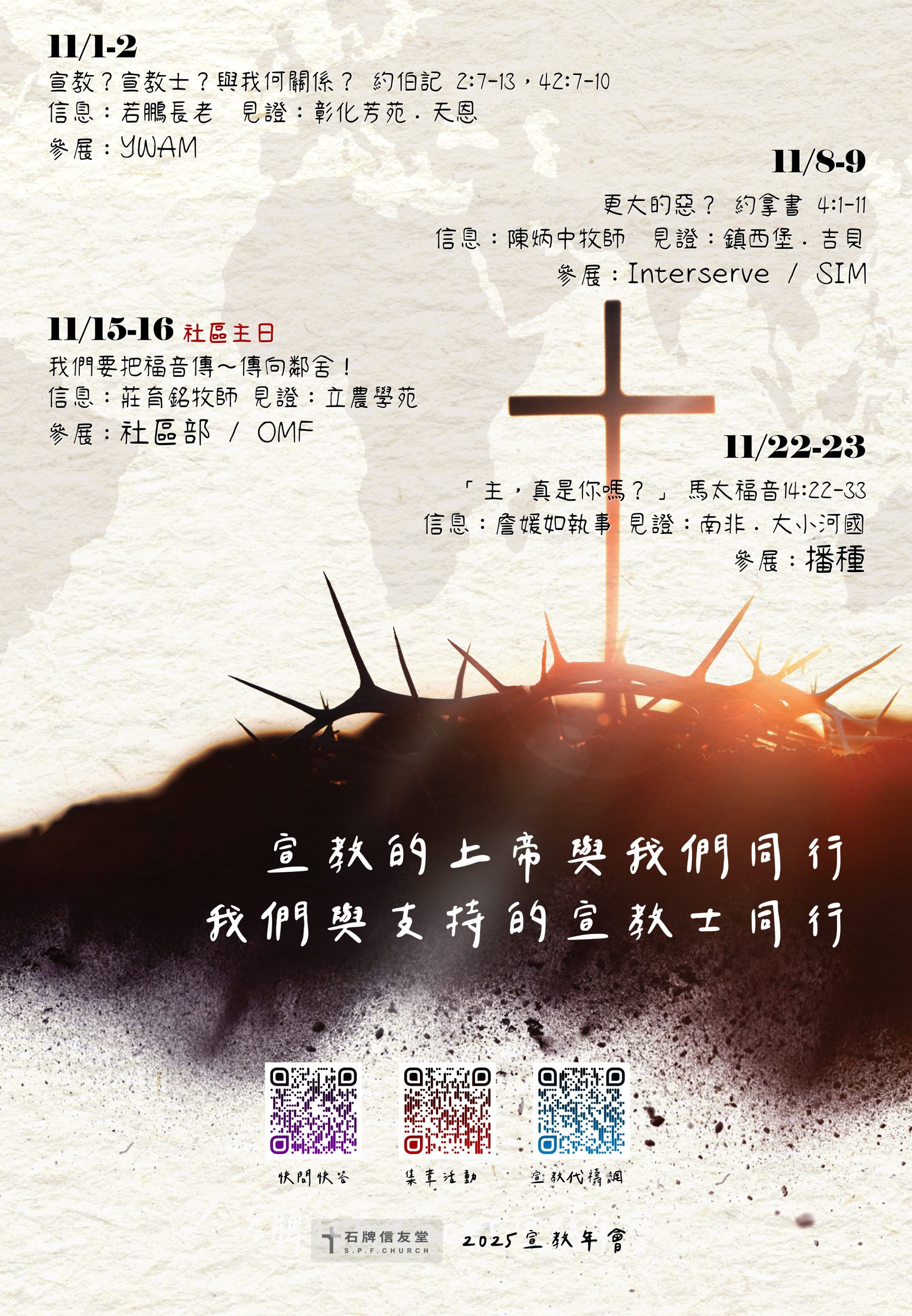 歡迎您,來到石牌信友堂 屬靈的家 這裡是家人聚集的地方這裡是一起認識耶穌的地方我們在生命的旅程中,彼此同行 新朋友指引 教會, 以上帝的道為中心 聖經,讓我們的生命有方向與根基門訓,讓我們充滿愛與跟隨耶穌的行動宣教,讓我們活在這世界,且影響這個世界 認識我們 本週崇拜預告 本週週報 新朋友指引 崇拜直播 舊版網站 怎麼到教會 行事曆 團契小組介紹 代禱需要 報帳申請 官方Line教學 重要消息公告 2025社區宣教月 瞭解更多 2025立農學苑 瞭解更多 2025短宣資訊 瞭解更多